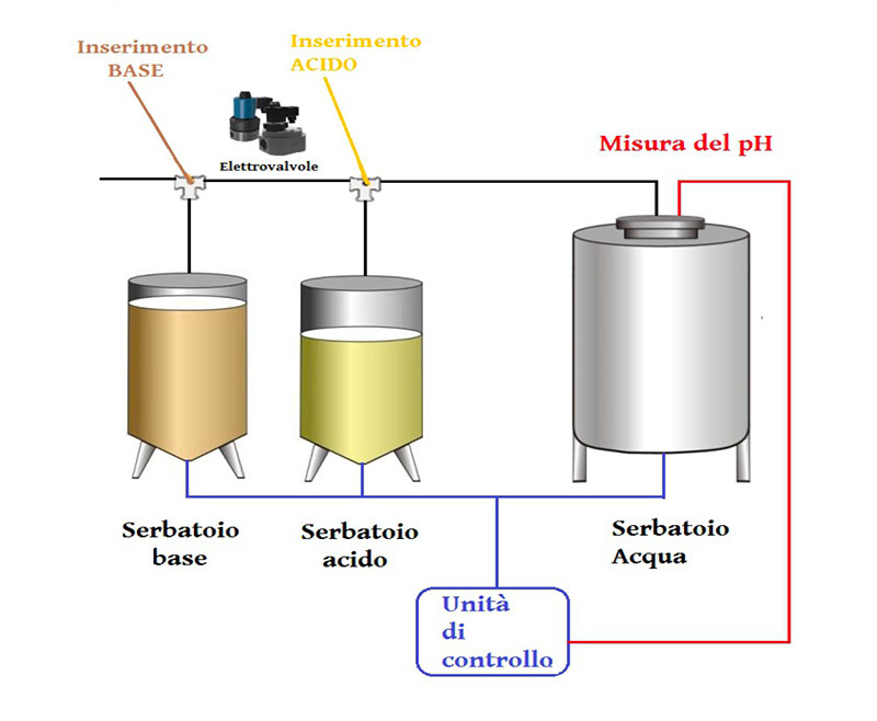 Nel trattamento delle acque, possiamo immaginare un sistema automatico per la neutralizzazione del pH come un impianto completamente programmabile, in grado di gestire tramite l’apertura e la chiusura di elettrovalvole l’attivazione di agitatori e di pompe dosatrici al fine di normalizzare il pH nella soluzione controllata. Il processo è ciclico con controllo continuo, e le varie fasi possono essere così riassunte: